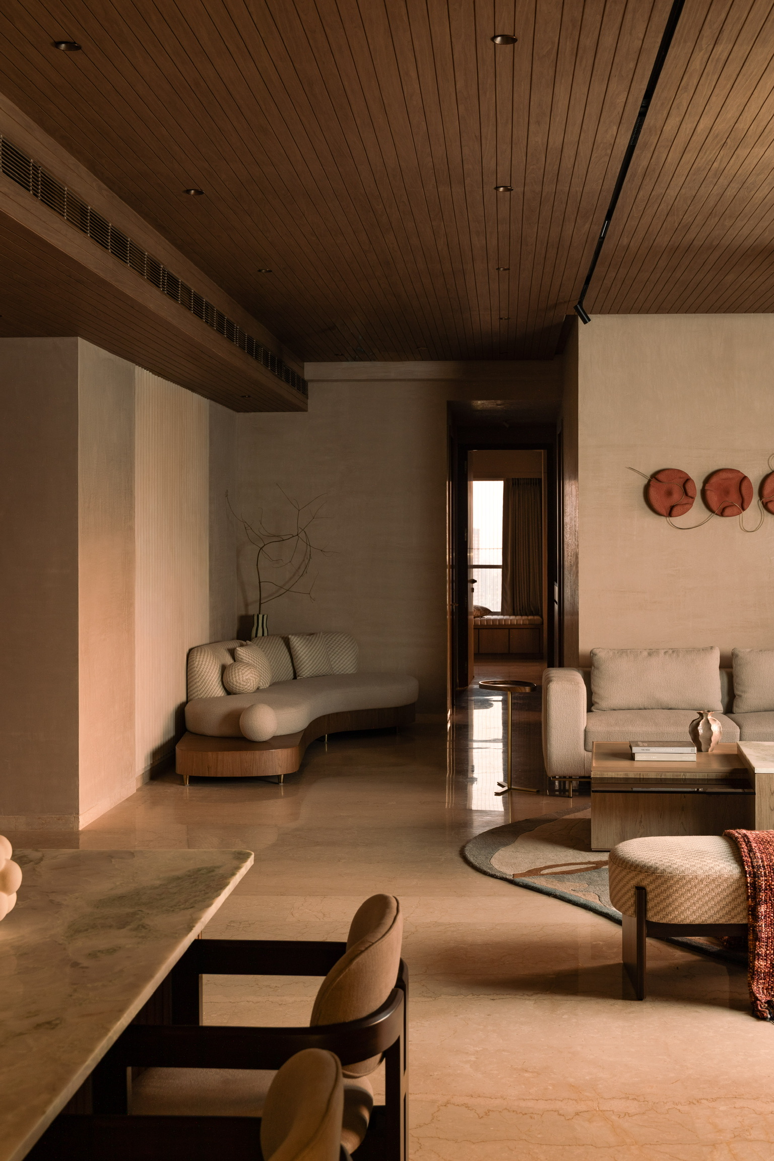 Aquaria Grande (Saanjh Residence), Mumbai | Curved light, textured and integrated—blending seamlessly into the ceiling. Featured in Elle Decor India